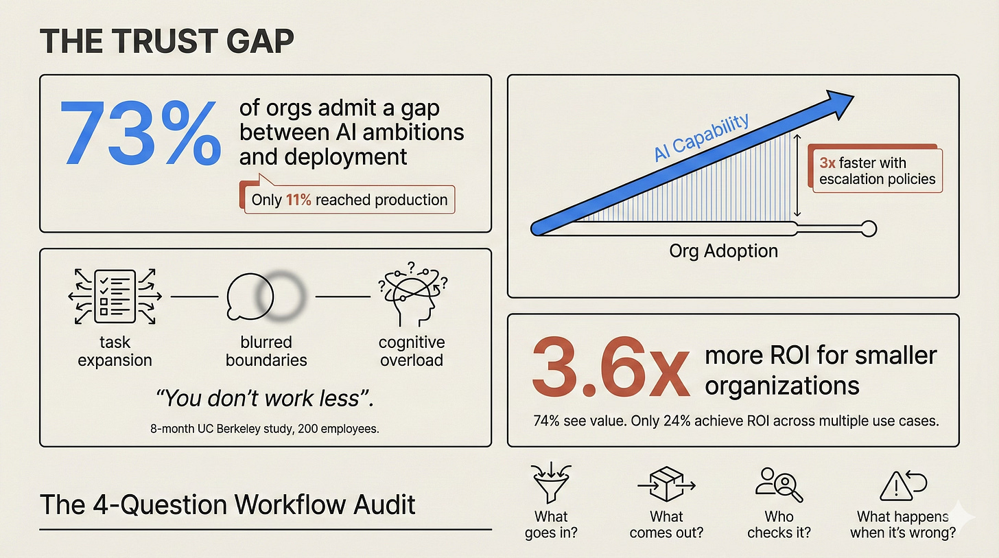 The buried finding: companies with escalation policies scale 3x faster. Translated out of enterprise language, an “escalation policy” just means answering one question in advance: “When the AI gets it wrong, who checks it before it goes anywhere?” That’s it. That simple decision, made before something breaks, is the difference between teams that use AI daily and teams that dabble once a month.